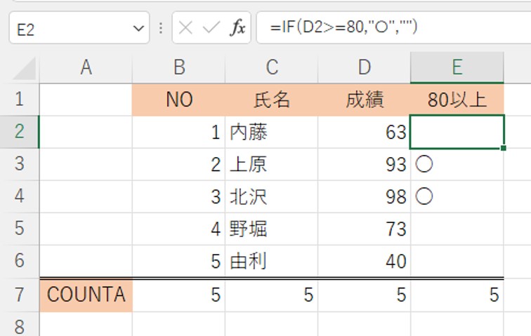 用意した表の、C列の成績が80点以上の件数を算出する場合で確認をします。